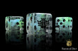 These contain a base of clear translucent swirled with a ghostly green and otherworldly blues and inlaid with a deep black; resin 16mm dice. The symbols are on the 6 side. These come in round corners.