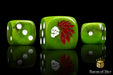 These contain a mix of avian greens swirled with darker camouflage green hues and inlaid with a two-toned fierce red and pure white; resin 16mm dice.